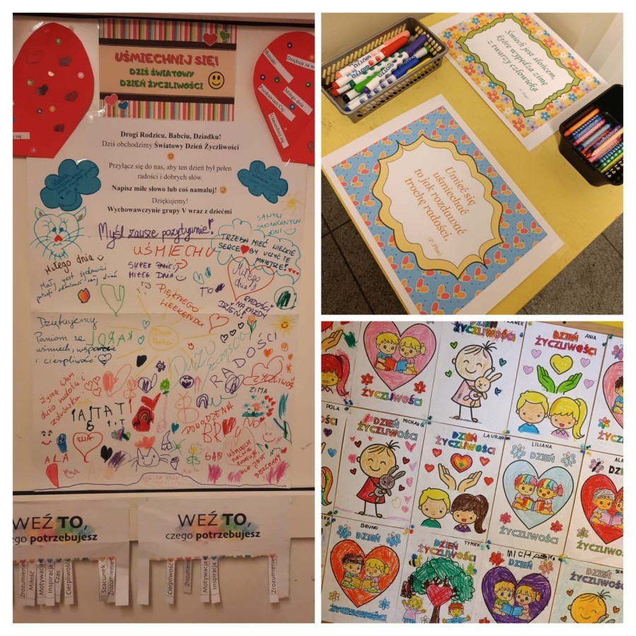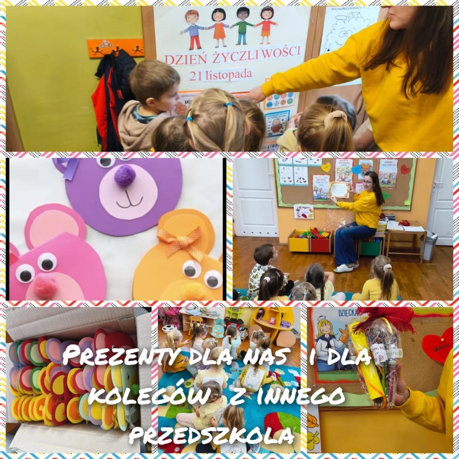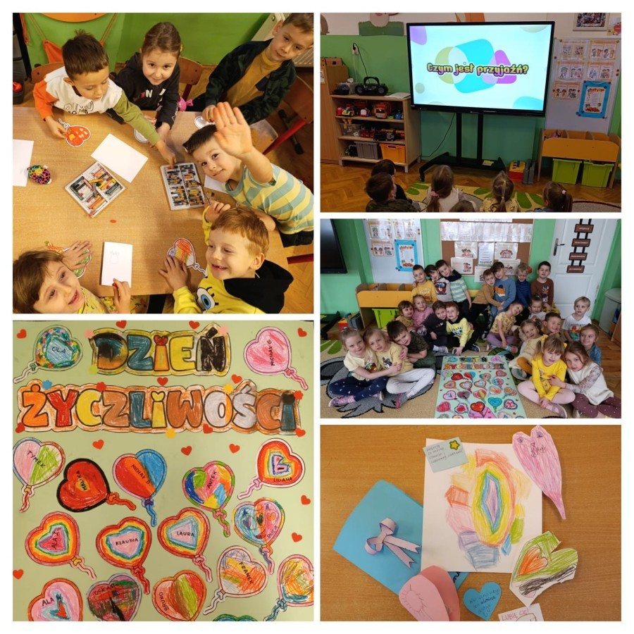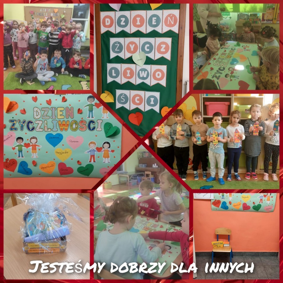 Dzieci z grupy V uczestniczyły w rozmowie na temat bycia miłym i życzliwym oraz brały udział w "komplementowym kręgu". Wspólnie tworzyły łańcuch życzliwości" oraz wykonały plakat przedstawiający dobre uczynki. Dzieci obejrzały prezentację multimedialną o życzliwości i współpracy. Tego dnia dzieci były ubrane na żółto. Otrzymano paczkę prezentową i list od zaprzyjaźnionego przedszkola w ramach akcji "Życzliwość", dla którego wcześniej przygotowano własnoręczne upominki. W szatni zorganizowano plakat dla rodziców, na którym mogli wpisać miłe słowo.