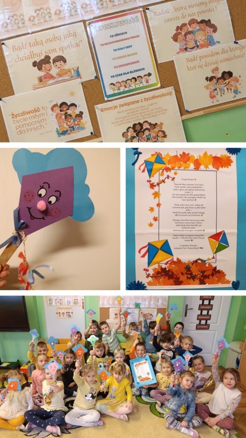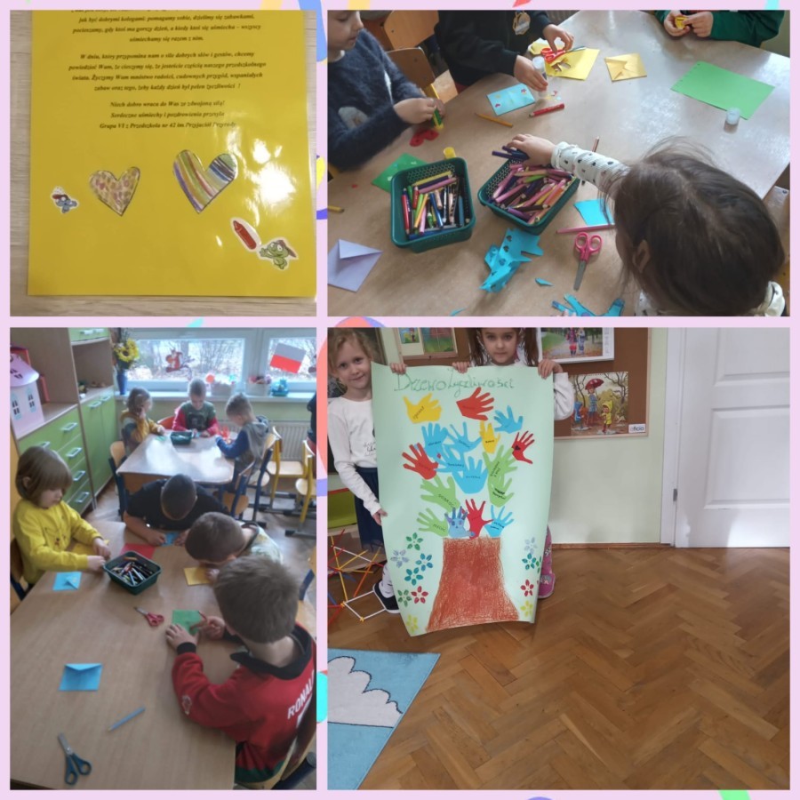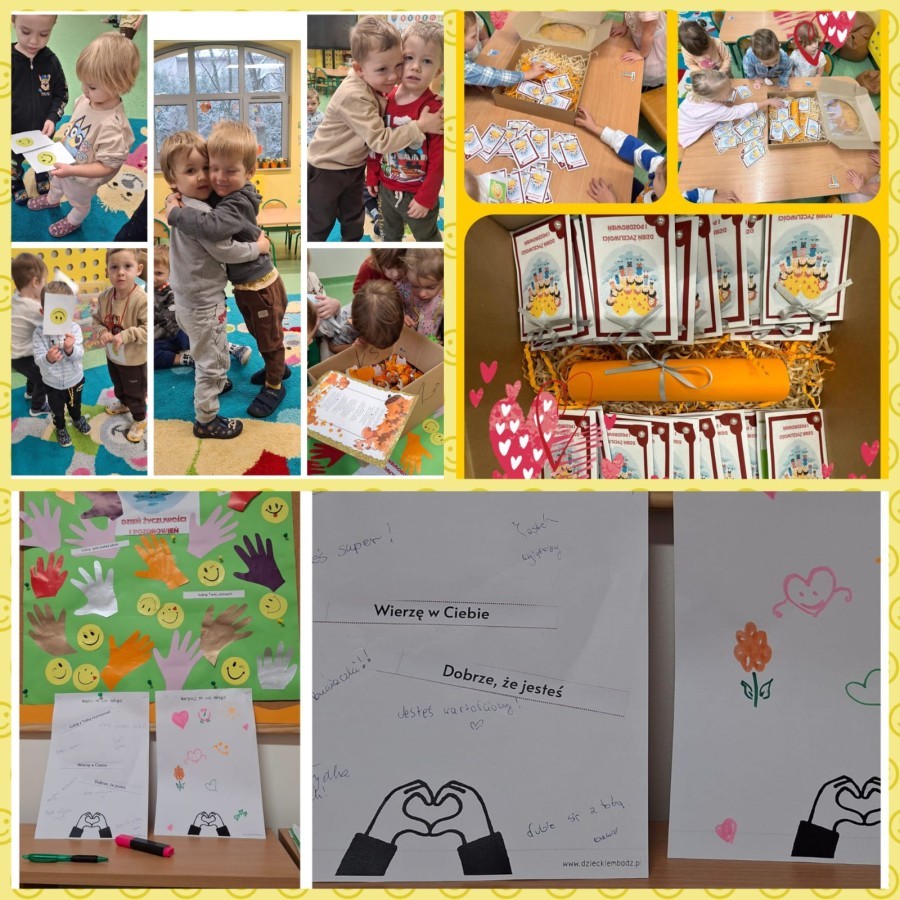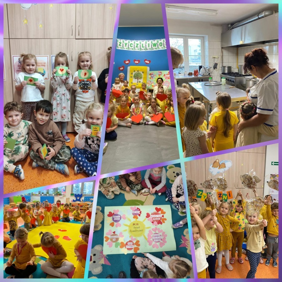 Dzieci z grupy V uczestniczyły w rozmowie na temat bycia miłym i życzliwym oraz brały udział w "komplementowym kręgu". Wspólnie tworzyły łańcuch życzliwości" oraz wykonały plakat przedstawiający dobre uczynki. Dzieci obejrzały prezentację multimedialną o życzliwości i współpracy. Tego dnia dzieci były ubrane na żółto. Otrzymano paczkę prezentową i list od zaprzyjaźnionego przedszkola w ramach akcji "Życzliwość", dla którego wcześniej przygotowano własnoręczne upominki. W szatni zorganizowano plakat dla rodziców, na którym mogli wpisać miłe słowo.