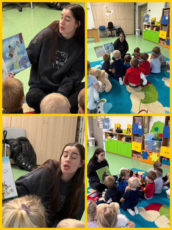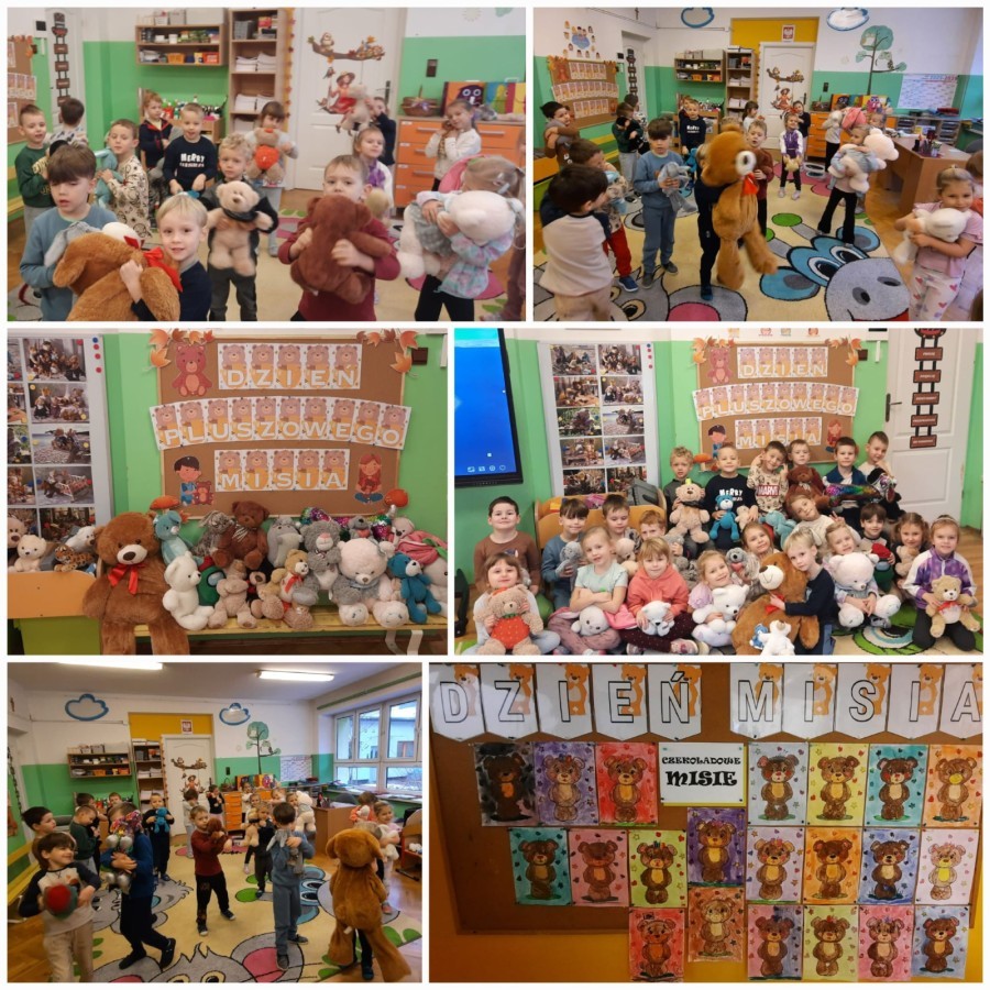 Dzień Pluszowego Misia- w tym dniu dzieci z grupy V spędziły czas wesoło i twórczo - bawiły się ze swoimi pluszakami, tańczyły przy ulubionej muzyce oraz wykonywały pracę plastyczną malując misie czekoladą.