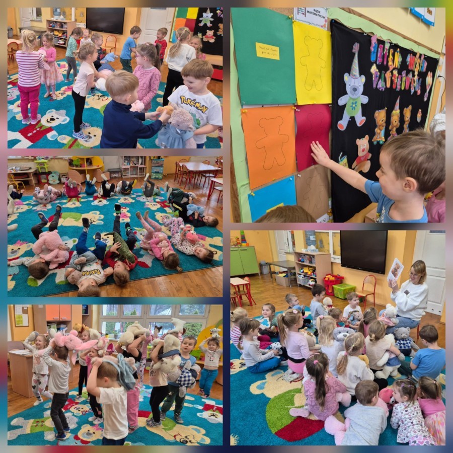 W grupie I przedszkolaki poznały historię powstania pluszowego misia, wesoło bawiły się ze swoimi ukochanymi misiami przyniesionymi z domu, a na koniec wykonały piękne "misiowe prace" jednocześnie ćwicząc wycinanie nożyczkami.