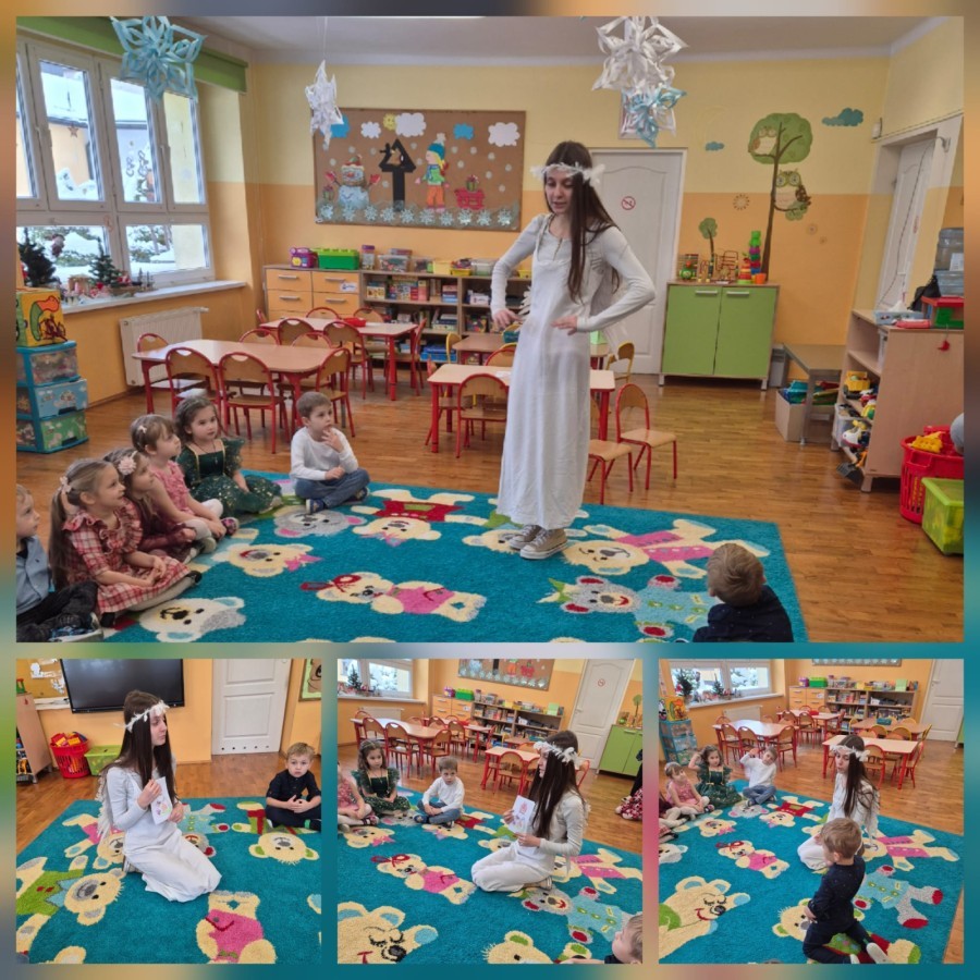 Wizyta Aniołka. Do dzieci przybył Aniołek, który miał koszyk pełen listów do Mikołaja. Z uśmiechem zabrał wszystkie napisane wcześniej przez dzieci listy i wysłuchał pięknej piosenki, którą przygotowały dla niego. W grupie IX dzieci dodatkowo złożyły przysięgę, że zawsze będą się grzecznie bawić. :)
