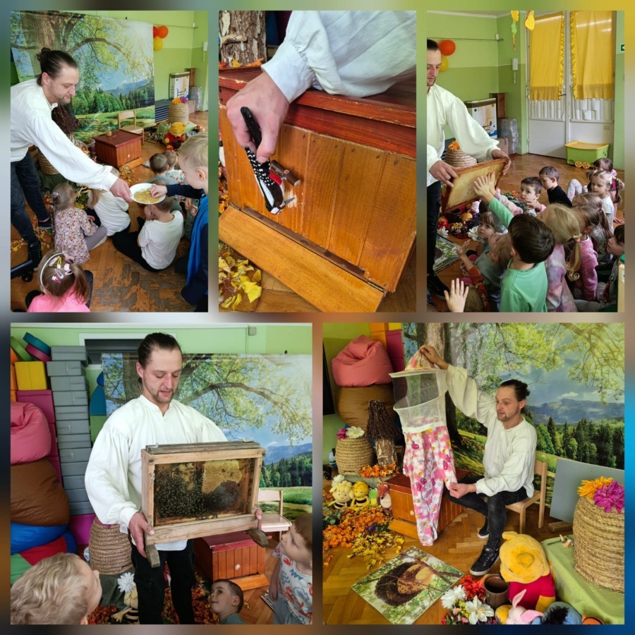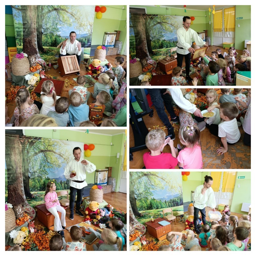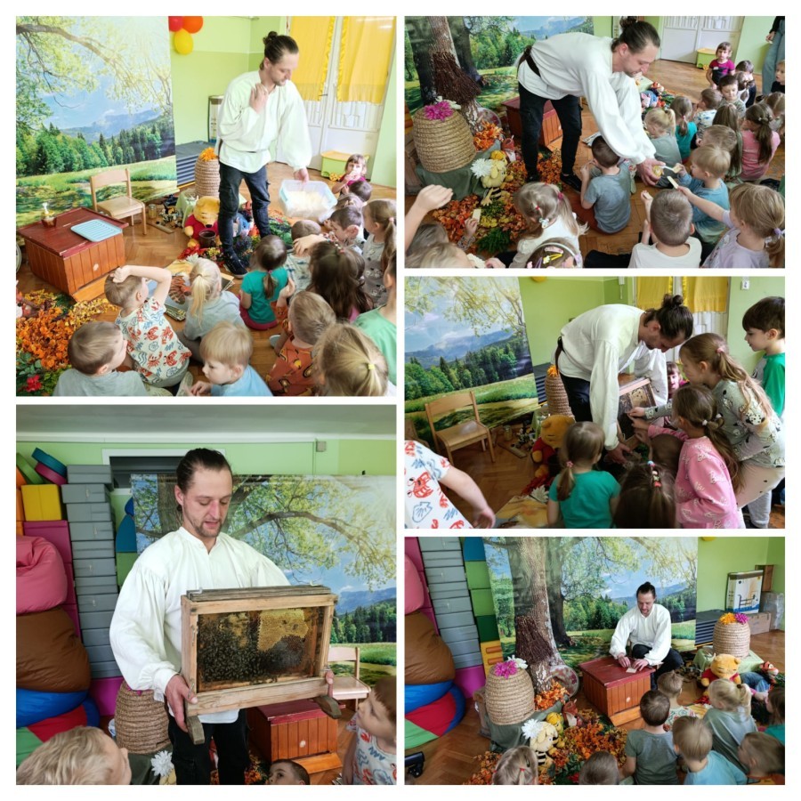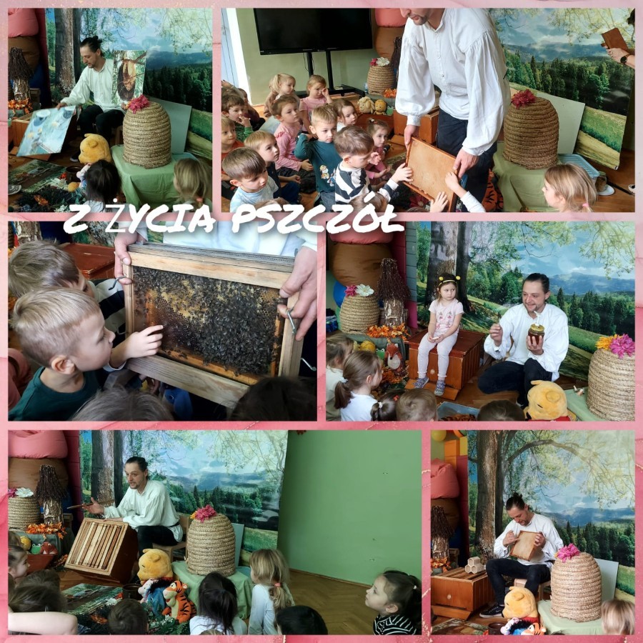 Zajęcia edukacyjne z żywą przyrodą - PSZCZOŁY. Podczas spotkania dzieci poznały życie pszczół, pracę pszczelarza-jego strój, narzędzia pracy. Obserwowały pszczoły w specjalnym zamkniętym ulu, próbowały miodu i poznały inne pszczele produkty, robiły świeczki. Dowiedziały się, jak ważną rolę w życiu człowieka pełni pszczoła oraz jak je chronić.