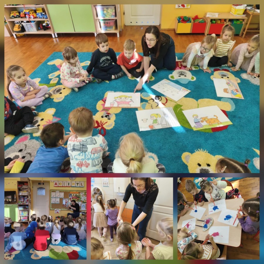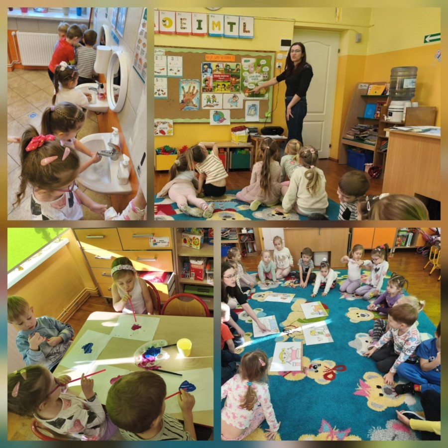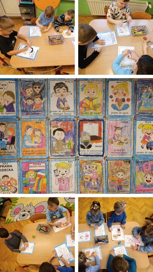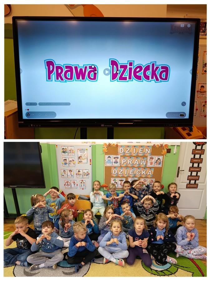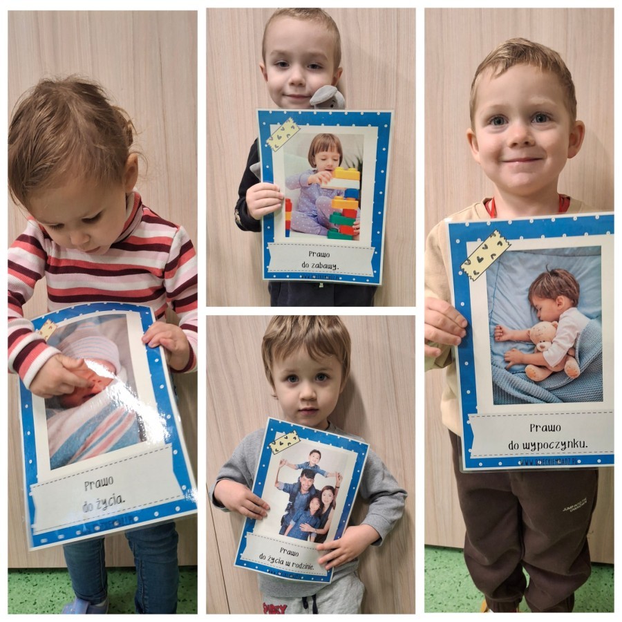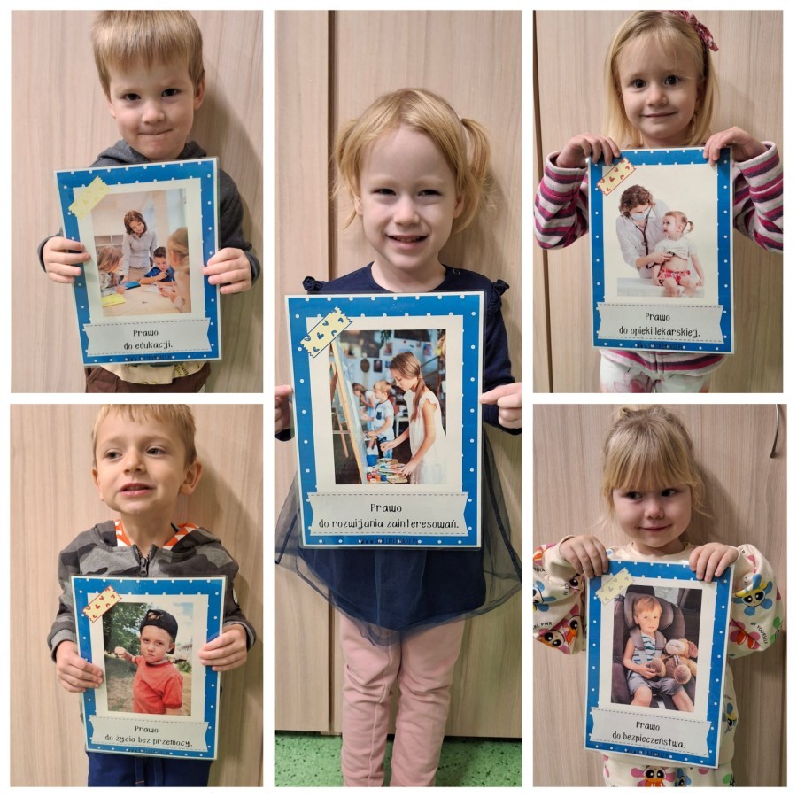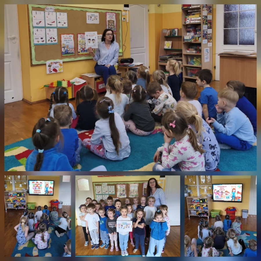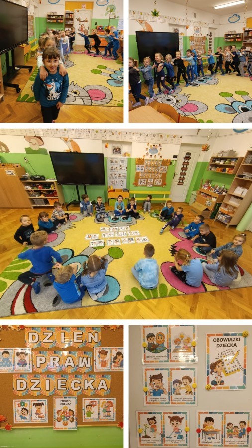 W grupie V obchodziliśmy Dzień Praw Dziecka. Podczas zajęć dzieci poznały najważniejsze prawa, takie jak prawo do zabawy, miłości, nauki, bezpieczeństwa. Oglądaliśmy ilustracje przedstawiające różne sytuacje z życia dzieci na całym świecie, a następnie wspólnie rozmawialiśmy o tym, dlaczego każde dziecko powinno być traktowane z szacunkiem. Grupa wykonała także prace plastyczne "Mam prawo do..."., na których umieszczono rysunki i hasła przedstawiające prawa dziecka. Obchody dnia uczyły empatii, szacunku oraz dbania o siebie i innych.