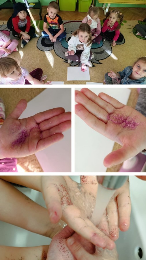 Grupa I również wzięła udział w akcji "Wirusoochrona". Dzieci dowiedziały się, kiedy i jak należy myć ręce. Trenowały dokładne mycie rąk według kolejnych etapów instruktażu. Tworzyły również pracę plastyczną pt. "WIRUSY" rozdmuchując farbę na papierze wykorzystując słomkę.