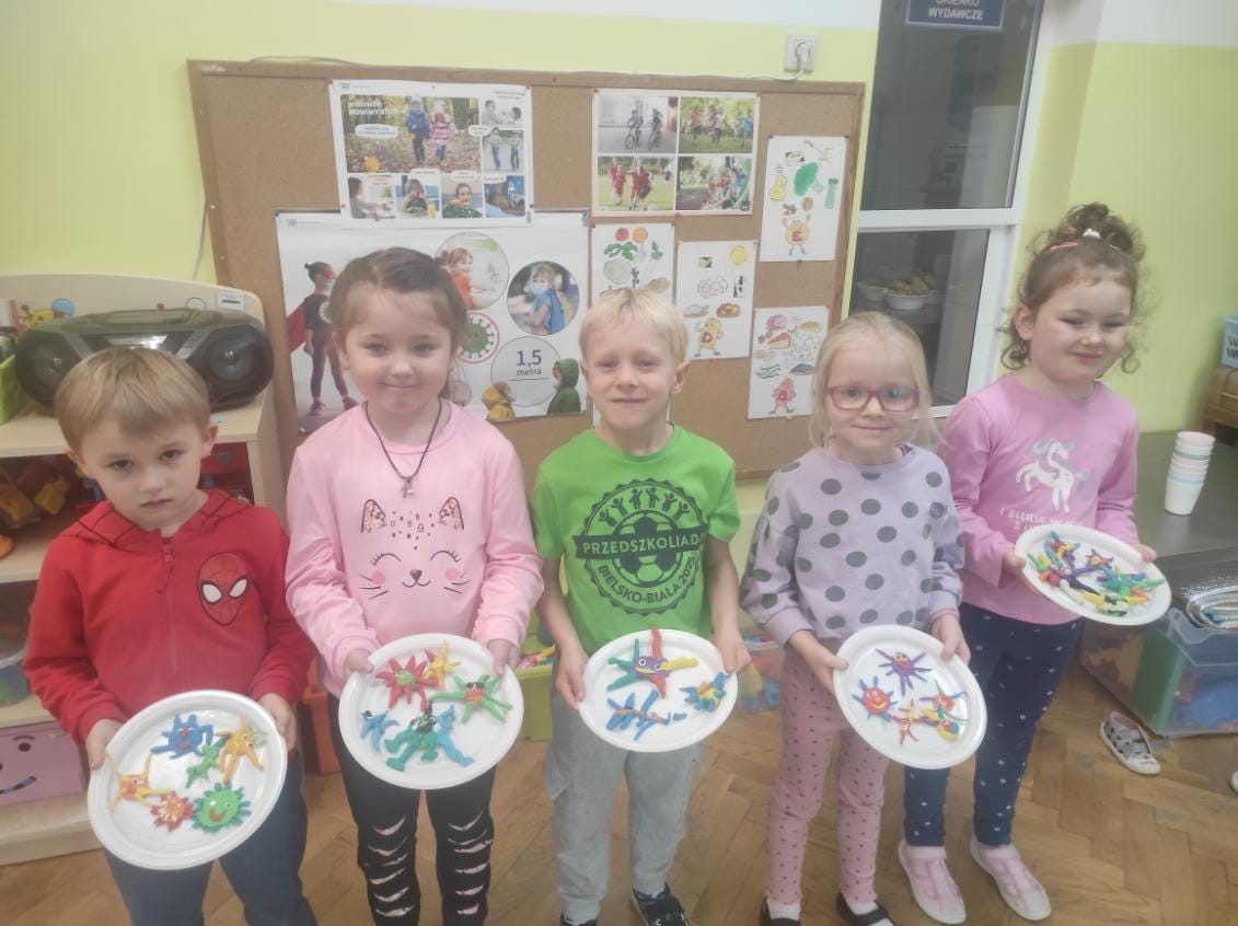 W grupie II Akcja Wirusoochrony została przeprowadzona 17.11.2025r. Zgodnie z zaleceniami w trakcie pracy z dziecmi poruszano tematykę dbałości o zdrowie, dostrzeganie roli higieny osobistej. Zwracano uwagę na warunki nasilonego zagrożenia w trakcie rozprzestrzeniania się chorób zakaźnych oraz roli szczepień w celu powstrzymania szerzenia się chorób. Wirusy wykonaliśmy z plasteliny.