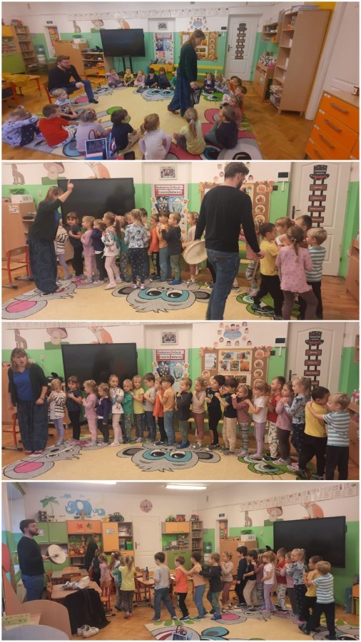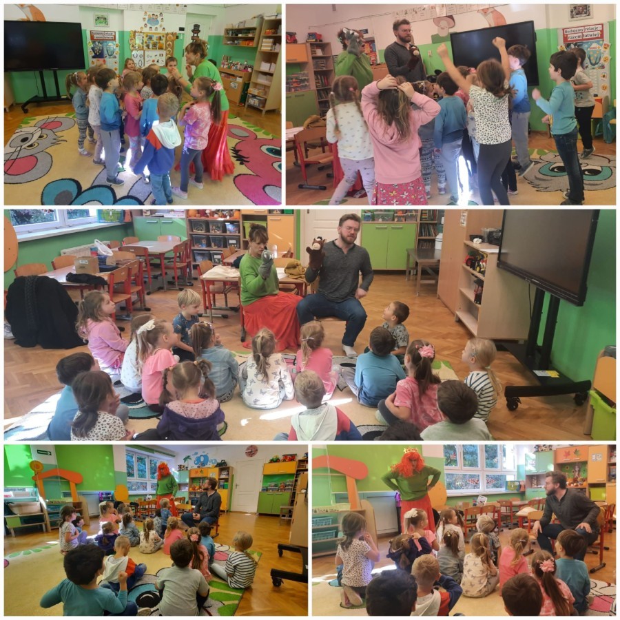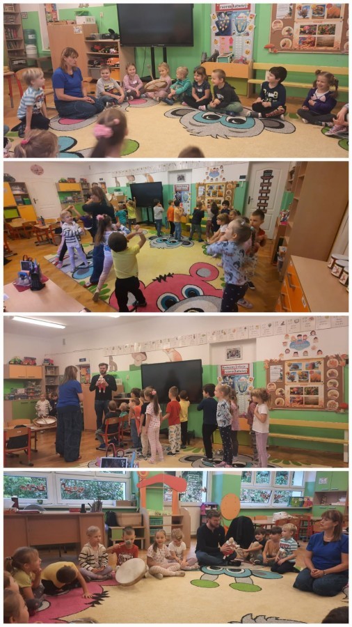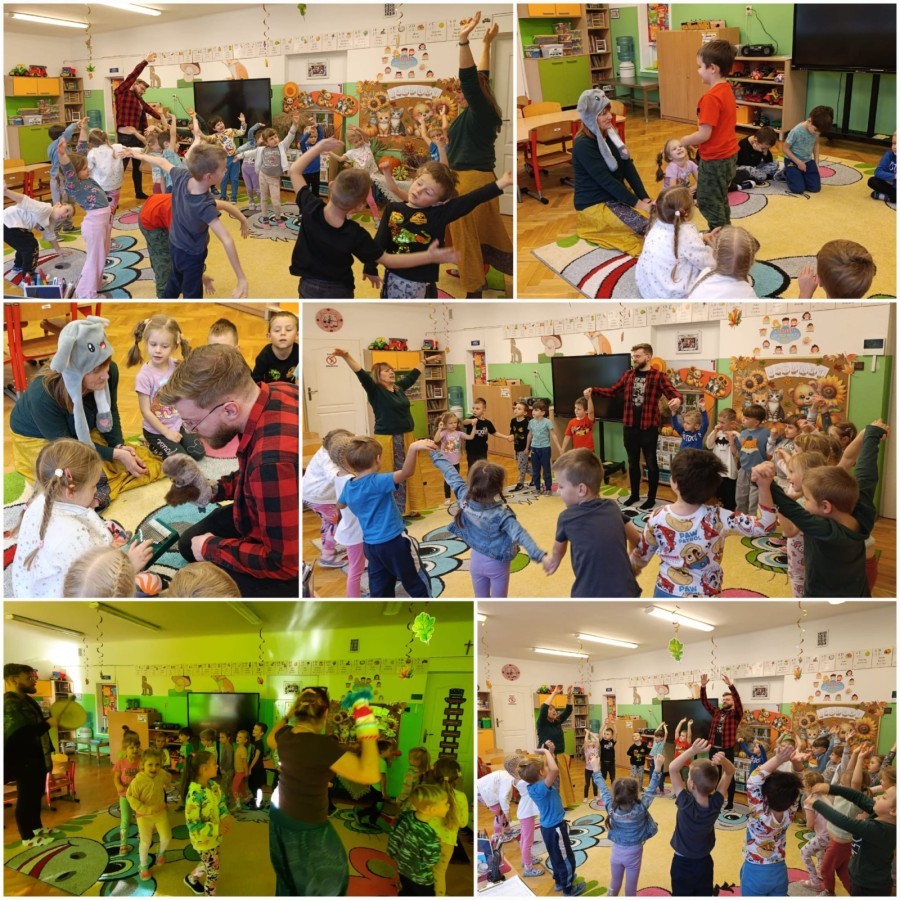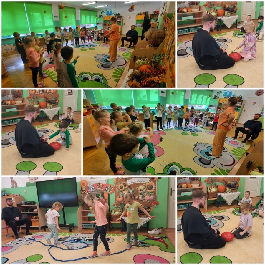 W październiku dzieci z Grupy V wzięły udział w Programie „Poruszające Bajki o Emocjach”, przygotowanym przez specjalistów zajmujących się edukacją emocjonalno-społeczną najmłodszych. Program był wyjątkową podróżą w świat uczuć i relacji, której celem było wspieranie rozwoju emocjonalnego dzieci, uczenie rozpoznawania, nazywania i wyrażania emocji w bezpieczny i konstruktywny sposób oraz wzmacnianie kompetencji społecznych, empatii i współpracy w grupie. Podczas dziesięciu spotkań z wykwalifikowanymi trenerami przedszkolaki poznawały codzienne sytuacje związane z przeżywaniem uczuć i odkrywały, że każda emocja – nawet ta trudna – jest ważna i potrzebna. Każde zajęcia poświęcone były innej emocji, dlatego dzieci z ciekawością przenosiły się do świata bohatera danej bajki, odwiedzając krainę frustracji, złości, smutku, wstydu, strachu, zazdrości czy rozczarowania, a także doświadczając dumy, radości i wdzięczności. Dzięki temu mogły lepiej zrozumieć, co czują w podobnych sytuacjach, i poznać sposoby radzenia sobie z napięciem oraz nieprzyjemnymi przeżyciami. Warsztaty miały charakter aktywny, a ich ogromnym atutem była możliwość grania na różnorodnych instrumentach – bębnach, kalimbach, tingszach, gongach, kubkach burzowych czy instrumentach perkusyjnych. Dzieci grały na nich intuicyjnie, bez zasad i nut, poprzez ruch, rytm i dźwięk mogły wyrażać emocje w naturalny i twórczy sposób. Program wykorzystywał metody oparte na dramie, muzykoterapii, bajkoterapii, zabawach integracyjnych, ćwiczeniach relaksacyjnych i działaniach plastycznych, co angażowało wszystkie zmysły oraz wspierało rozwój wyobraźni i poczucia sprawczości. Udział w programie wpłynął na poprawę komunikacji między dziećmi, zwiększył ich odwagę do mówienia o swoich uczuciach oraz świadomość tego, jak emocje objawiają się w ciele. Zajęcia cieszyły się dużym zainteresowaniem, a dzieci brały w nich udział z radością, aktywnością i zaangażowaniem. Był to czas pełen odkryć, rozmów i wspólnych przeżyć, który znacząco wzbogacił codzienną pracę wychowawczą naszej grupy i z pewnością pozostanie w pamięci dzieci na długo. Program „Poruszające Bajki o Emocjach” okazał się piękną i wartościową przygodą w rozwijaniu kompetencji potrzebnych każdemu młodemu człowiekowi.